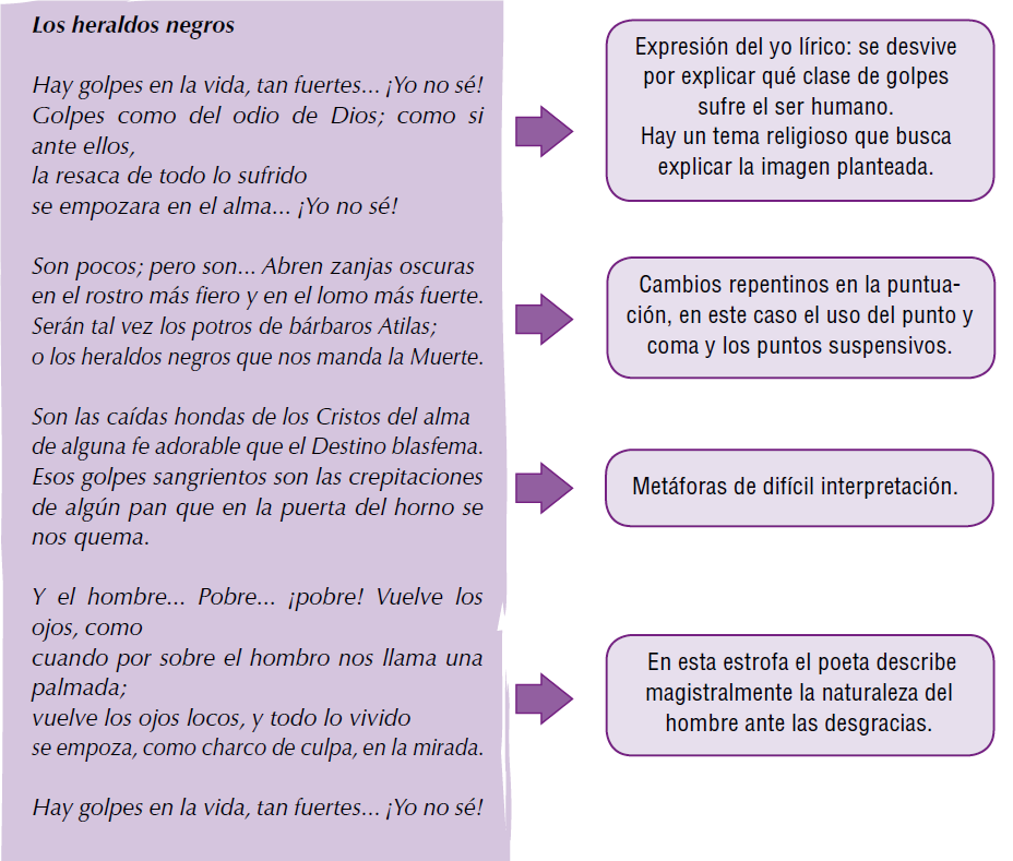 Como vimos en la Indagación, el poema Los heraldos negros muestra un lenguaje lírico renovado. La emotividad de los temas se conjuga con la experimentación, buscando nuevas formas poéticas. Cuando lo comparamos con los textos de los temas anteriores, encontramos que cada uno refleja preocupaciones diferentes y recursos expresivos distintos. Esta búsqueda fue la de algunos escritores quienes quisieron tomar distancia de los modelos preestablecidos